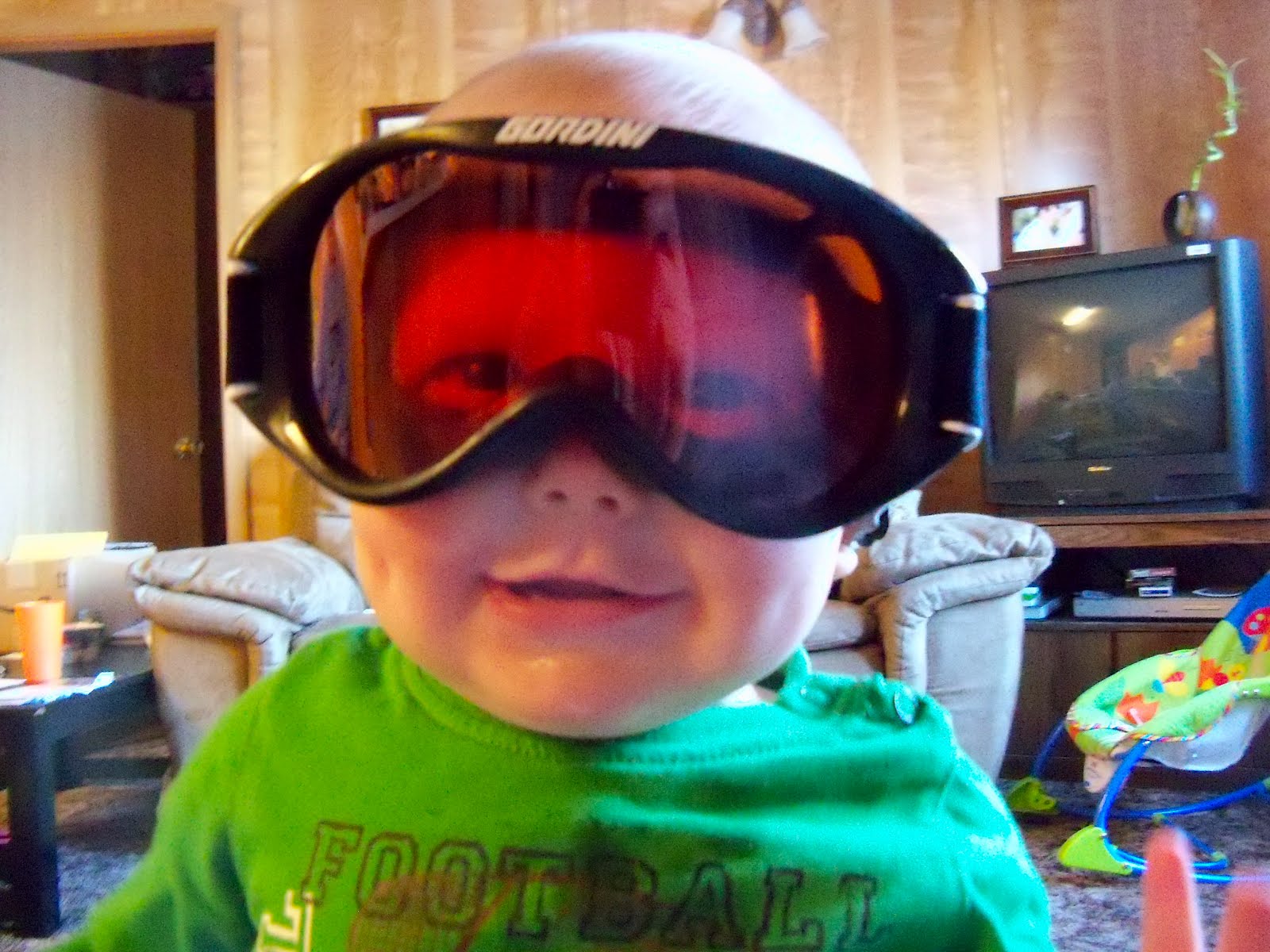 His favorite toys are anything but his toys, Kayla's school books, Cabela's fliers, the garbage can, pots, the mitten box, and shoes. I think he will have a blast when it warms up a little when his snowsuit gets here.
